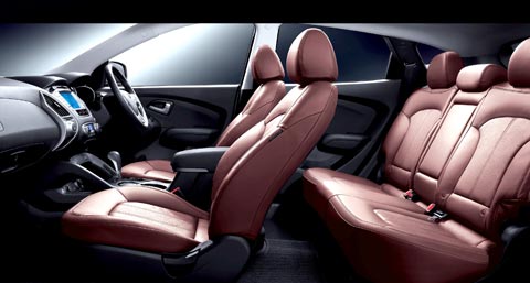 ด้านภายในเพียบพร้อมทั้ง หลังคาแก้ว และ Sunroof แบบ panorama เปิด/ปิดด้วยไฟฟ้า ระบบปรับอากาศอัตโนมัติแบบแยกส่วน Dual Zone พร้อมระบบฟอกอากาศ Cluster Ionizer เครื่องเสียงคุณภาพสูง พร้อมลำโพง 6+1 ตัว รองรับการเชื่อมต่อทาง USB และ iPod พวงมาลัยมัลติฟังก์ชัน ควบคุมเครื่องเสียงและ Cruise Control Trip Computer ช่วยคำนวน เชื้อเพลิง และระยะทาง รวมทั้งข้อมูลการเดินทางอื่นๆ ระบบ Smart Key เปิดปิดประตูได้โดยไม่ต้องถือกุญแจ ปุ่มสตาร์ท (Start Button) ที่ทันสมัย เบาะหลังพับแยกได้ 60:40 และปรับราบได้เพื่อบรรทุกสัมภาระได้อย่างสะดวก เบาะหนังแท้รอบคัน สี Conac Brown สไตล์ยุโรป เป็นต้น จะเห็นได้ว่าอุปกรณ์มาตราฐานที่ให้มาครบครัน สำหรับข้อแตกต่างของ The New Hyundai Tucson 2.0 รุ่น 2WD กับรุ่น 4WD มีเพียงระบบขับเคลื่อนเท่านั้น ขึ้นอยู่กับว่าจะเลือกแบบรุ่น 2WD หรือรุ่น 4WD