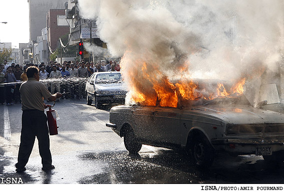 4.ดับไฟ (ต่อ) เมื่อไฟเริ่มเบาหรือใกล้สงบ คุณจึงควรจะเปิดฝากระโปรงได้ แต่แน่นอน ฝากระโปรงทำด้วยเหล็ก ถ้าไม่มีผ้าอะไรที่พอหยิบจับได้ ก็เอาเสื้อนี่แหละพันมือจะได้ไม่พองจากความร้อน กรณีที่ไม่สามารถเปิดฝากระโปรงได้ ให้หาอุปกรณ์งัด แต่เมื่อเปิดได้แล้ว ให้รีบฉีดห้องเครื่องให้ทั่ว และให้มั่นใจว่าเพลิงสงบจริงๆ