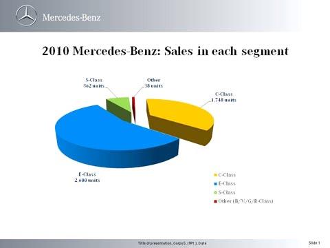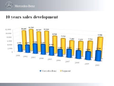 เมอร์เซเดส-เบนซ์ยังสามารถครองความเป็น ที่หนึ่งของตลาดรถหรูในเมืองไทยเป็นปีที่ 10 ติดต่อกัน ด้วยยอดขายในปี 2010 ที่สามารถครองส่วนแบ่งการตลาดของตลาดรถยนต์หรูได้ถึง 48% หรือคิดเป็นยอดจำหน่ายรวม 4,748 คัน เติบโตเพิ่มขึ้นถึง 23%