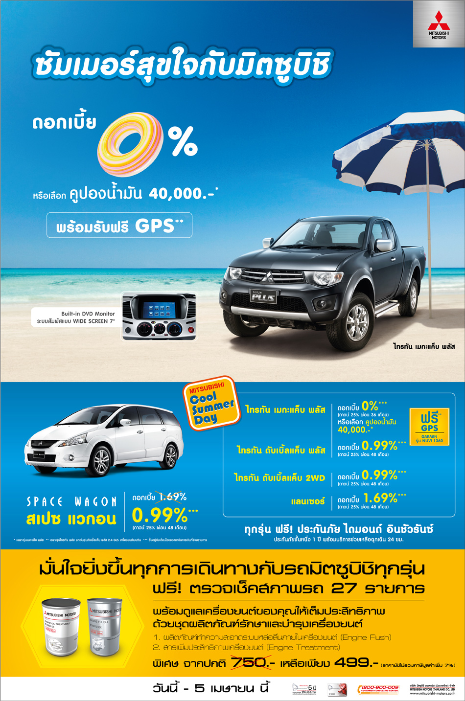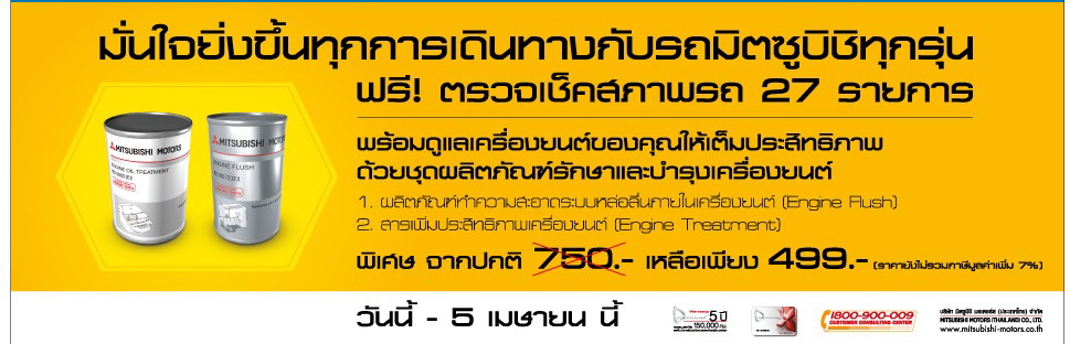 พิเศษ...สำหรับลูกค้ารถยนต์มิตซูบิชิทุกท่านสามารถซื้อผลิตภัณฑ์ทำความสะอาดระบบหล่อลื่นภายในเครื่องยนต์ Engine Flush และสารเพิ่มประสิทธิภาพเครื่องยนต์ Engine Treatment ซึ่งเป็นผลิตภัณฑ์นำเข้าจากประเทศญี่ปุ่น ในช่วงนี้ ได้ในราคาเพียงชุดละ 499* บาท จากราคาปกติ 750* บาท