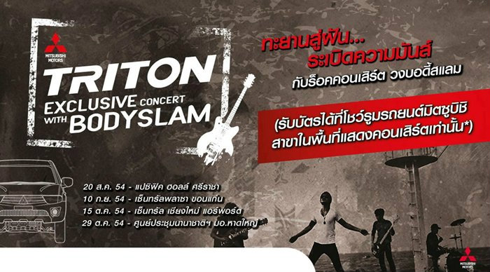 โดยเฉพาะกระแสตอบรับเป็นอย่างดีจากการจัดคอนเสิร์ตใหญ่ที่ไบเทค บางนา เมื่อกลางเดือนพฤษภาคมที่ผ่านมา ในช่วงเดือนสิงหาคมถึงตุลาคมที่จะถึงนี้ บริษัทฯ จึงได้ร่วมกับผู้จำหน่ายในแต่ละภูมิภาคเตรียมจัดคอนเสิร์ตใหญ่ "มิตซูบิชิ ไทรทัน เอ็กซ์คลูซีพ คอนเสิร์ต กับบอดี้สแลม" อีกครั้งใน 4 หัวเมืองใหญ่ทั่วประเทศ ได้แก่ จังหวัดชลบุรี ขอนแก่น เชียงใหม่ และสงขลา
