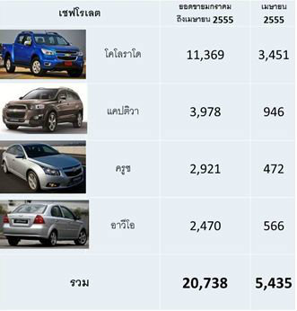 บริษัท เชฟโรเลต เซลส์ (ประเทศไทย) จำกัด เปิดเผยยอดจำหน่ายเดือนเมษายนอยู่ที่ 5,435 คัน เติบโตมากกว่าเดือนเดียวกันของปีที่แล้ว 79 เปอร์เซ็นต์ และมีอัตราขยายตัวนับตั้งแต่เดือนมกราคมถึงเมษายนอยู่ที่ 111 เปอร์เซ็นต์เมื่อเทียบกับช่วงเดียวกันของปี 2554