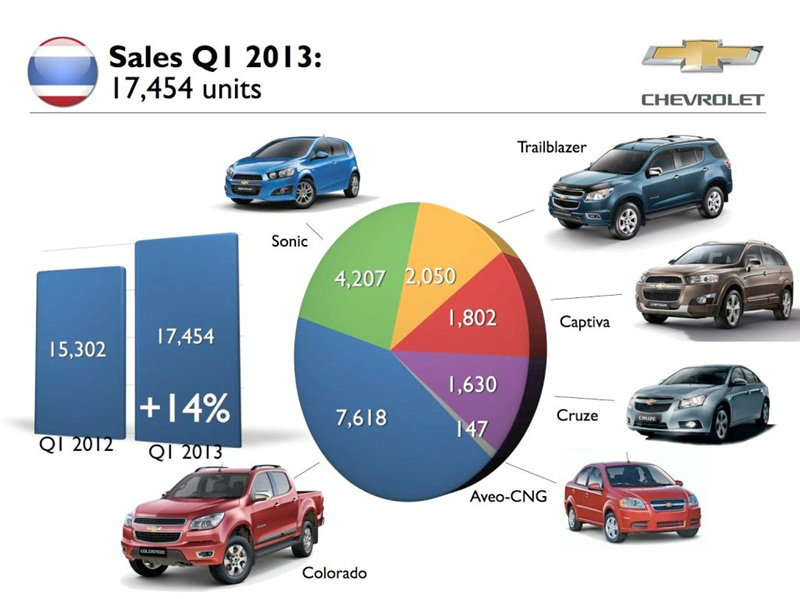ยอดขายทีเพิ่มสูงขึ้นเป็นผลมาจากการตอบรับที่ดีในรถยนต์หลายรุ่นของบริษัททั้ง รถกระบะโคโลราโด นำยอดขายด้วยตัวเลข 7,618 คันในช่วงสามเดือนแรกของปีนี้ ตามมาด้วยโซนิค ที่มียอดขาย 4,207 คัน ขณะที่เทรลเบลเซอร์ มีตัวเลขยอดขาย 2,050 คันขณะที่ครูซ มียอดขาย 1,640 คันและอาวีโอ ซีเอ็นจี 147 คัน ส่งผลให้ยอดขายของเชฟโรเลต ในเดือนมีนาคม 2556 รวมทั้งสิ้นอยู่ที่ 5,609 คัน