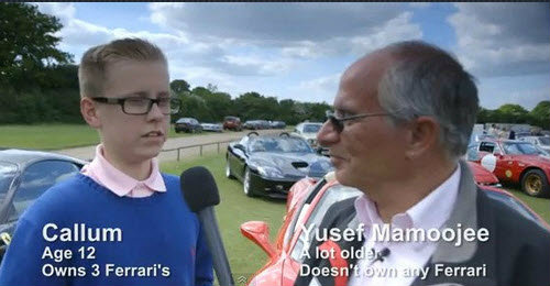พูดไปแล้วก็จะหาว่าอิจฉาเด็กมัน ก็คนธรรมดาอย่างเราๆคงไม่มีสิทธิได้ครอบครองหรอกครับเจ้า Ferrari เนี้ย แต่ที่น่าทึ่งคือเด็กอายุเพียง 12 ปี มี Ferrari แล้วถึง 3 คันคือ Ferrari 355, ,458 Italia ,599 GTO โดยเจ้าหนูคนนี้มีนามว่า “Callum” เรียกได้ว่าเป็นเศรษฐีตั้งแต่เด็ก จากการสร้าง Application ขายให้กับ Google โดยรายได้ที่ได้มามากถึง 8,500,000 £ หรือประมาณ 342.163 ล้านบาท นี่ก็เป็นจุดเริ่มต้นที่ “Callum” คิดที่จะซื้อ Ferrari