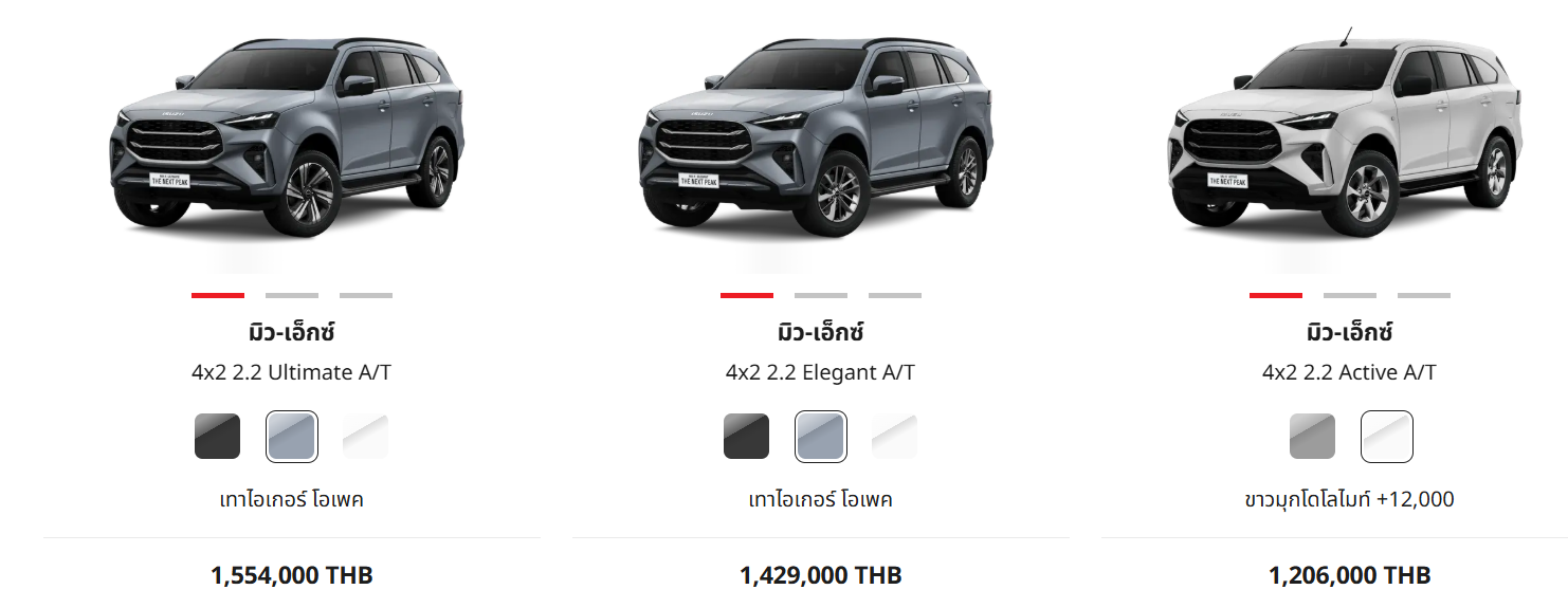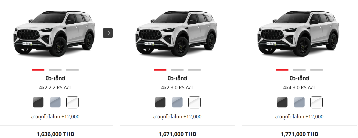 ราคาที่แสดงเป็นราคาเริ่มต้น โดยราคาตัวถังสีพิเศษ เช่น สีขาวมุก อาจมีค่าใช้จ่ายเพิ่มเติม (+12,000 บาท) ตามที่ระบุไว้