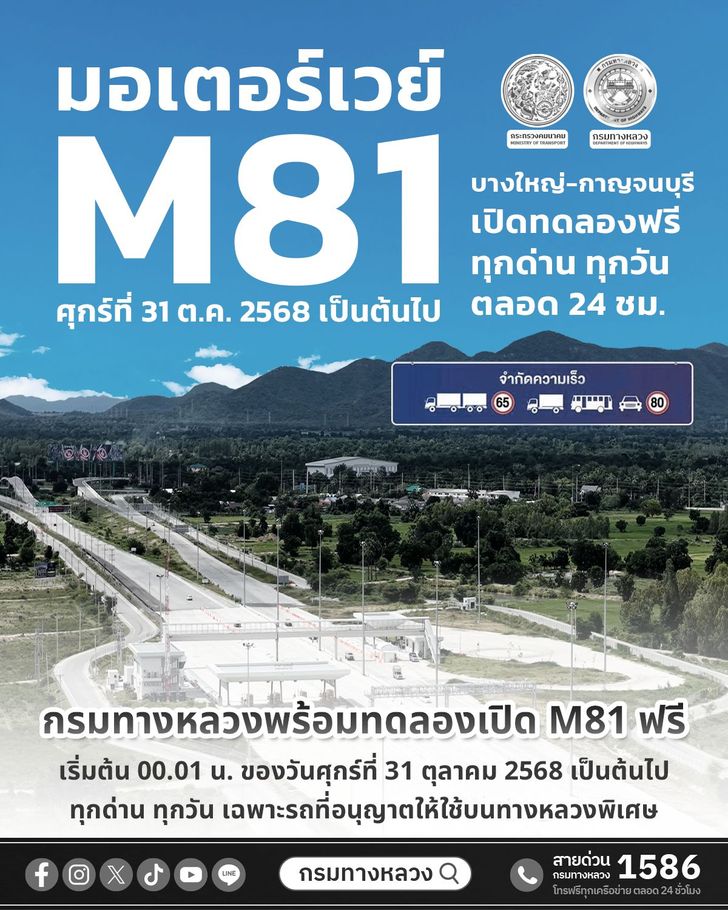 - มอเตอร์เวย์ M81 เปิดให้ใช้ฟรีแล้วตอนนี้ ตั้งแต่วันที่ 31 ตุลาคม 2568