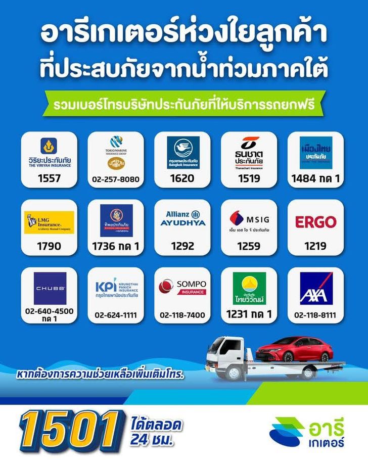 รวมเบอร์ฉุกเฉิน! "รถยกฟรี" ช่วยน้ำท่วมภาคใต้ จาก 15 บริษัทประกันภัย