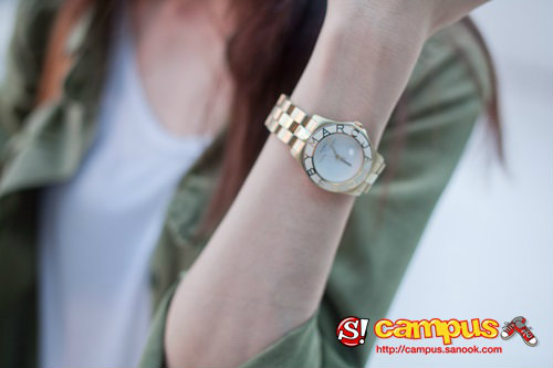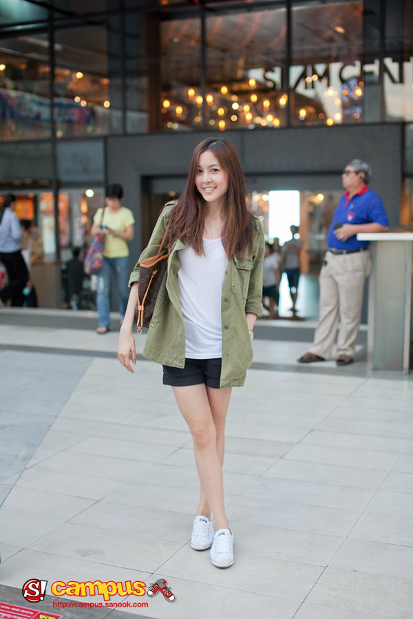 สตรีทแฟชั่นวัยรุ่น น้องเบลล์สาวน่ารัก อายุ 22 ปี กับแฟชั่นการแต่งตัวง่ายๆ สบายๆ เสื้อกล้ามสีขาวสวมทับด้วยเสื้อแจ็คเก็ตสีเขียวแนวทหารเท่ๆ กับกางเกงขาสั้น รองเท้าผ้าใบสีขาว นาฬิกาสีทอง Marc Jacobs สำหรับสาวหวานที่อยากเปลี่ยนแนวเซอร์ๆ ดูบ้าง ชุดนี้ก็ง่ายกับการมิกซ์แอนด์แมทซ์ดีนะคะ