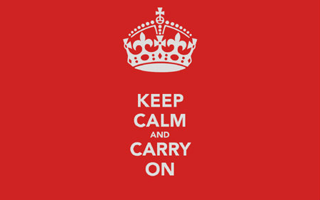 ตัวพิมพ์สีขาวขนาดใหญ่เรียงกันห้าบรรทัดบนพื้นสีแดง มีใจความว่า Keep Calm and Carry On หรือ "ใจเย็นๆ และก้าวต่อไป" นั้น มีน้ำเสียงที่ฟังดู "ผู้ดี๊-ผู้ดี" ซึ่งก็ไม่ผิด นี่เป็นโปสเตอร์อังกฤษในสมัยสงครามโลกครั้งที่ 2 ออกแบบในปี พ.ศ.2482 โดยกระทรวงข้อมูลข่าวสารเพื่อปลอบขวัญประชาชนในช่วงที่อังกฤษกำลังเข้าสู่สงครามโลกครั้งที่ 2