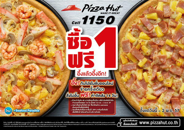 อึ้งแล้วอึ้งอีก! กับ "พิซซ่าฮัท ซื้อ 1 ฟรี 1" อึ้งแรก! กับความคุ้มค่า ให้คุณอิ่มเว่อร์กับพิซซ่าถึง 2 ถาด ในราคาแค่ถาดเดียว เริ่มต้นเพียง 299 บาท อึ้งกันต่อ! กับซีฟู้ดหน้าใหม่และอีกหลากหลาย เลือกอร่อยได้ตามใจกว่า 14 หน้า ทั้งแป้งหนานุ่ม ขอบชีส และ ขอบไส้กรอกชีส อึ้งให้สุด!!! สั่งเท่าไหร่ อร่อยฟรีเท่านั้น อร่อยจนหยุดไม่อยู่ได้แล้ว วันนี้ ถึง 2 พ.ย. 57 เท่านั้น ที่ร้านพิซซ่าฮัททุกสาขา โทรสั่ง 1150 หรือ ตามไปอึ้งกันต่อกับโปรโมชั่นพิเศษเฉพาะออนไลน์ คลิก www.pizzahut.co.th