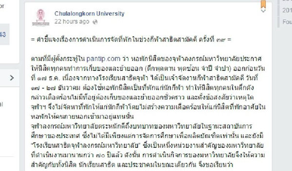 กรณีที่มีกระทู้พันทิปตั้งคำถามถึงกรณีที่จุฬาลงกรณ์มหาวิทยาลัย ประกาศให้นิสิตหอพักของมหาวิทยาลัยเก็บของเเละย้ายออกจากหอพัก เนื่องจากทางโรงเรียนสาธิตจุฬา ได้เป็นเจ้าจัดงานกีฬาสาธิตสามัคคี วันที่ 17 - 28 ธันวาคมจึงทำให้ต้องมีนักกีฬาจำนวนจากโรงเรียนสาธิตทั่วประเทศไทยมาพักที่จุฬา ซึ่งได้ใช้หอพักของนิสิตจุฬาเป็นที่พักแก่นักกีฬาทั้งหมดถึง 3,800 คน ซึ่งจากเหตุการณ์นี้ ทำให้มีนิสิตที่เดือดร้อนเป็นจำนวนมากเพราะว่าไม่มีที่อยู่ โดยทางหอพักประกาศให้นิสิตที่สามารถอยู่หอได้คือนิสิตที่ฝึกงานหรือติดการฝึกสอนอยู่เท่านั้น และให้อยู่รวมกันห้องละ 7 คน จากปกติที่สามารถรองรับได้เพียง 4 คน โดยจากคำสั่งดังกล่าวทำให้ นิสิตจำนวนมากได้รับความเดือดร้อน เพราะต้องขนของออกจากหอนำไปเก็บไว้ที่อื่น ซึ่งนิสิตหอพักส่วนใหญ่เป็นคนต่างจังหวัด หลายคนไม่มีญาติในกรุงเทพฯ