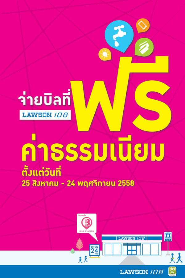 และพิเศษสุด "ลอว์สัน108" จัดโปรโมชั่น ฟรี! ค่าธรรมเนียม เมื่อใช้บริการ "บิล สเตชั่น" ชำระค่าใช้จ่ายจากบิลต่างๆ ในระหว่างวันที่ 25 สิงหาคม - 24 พฤศจิกายน ศกนี้ ณ "ลอว์สัน108" ทุกสาขา