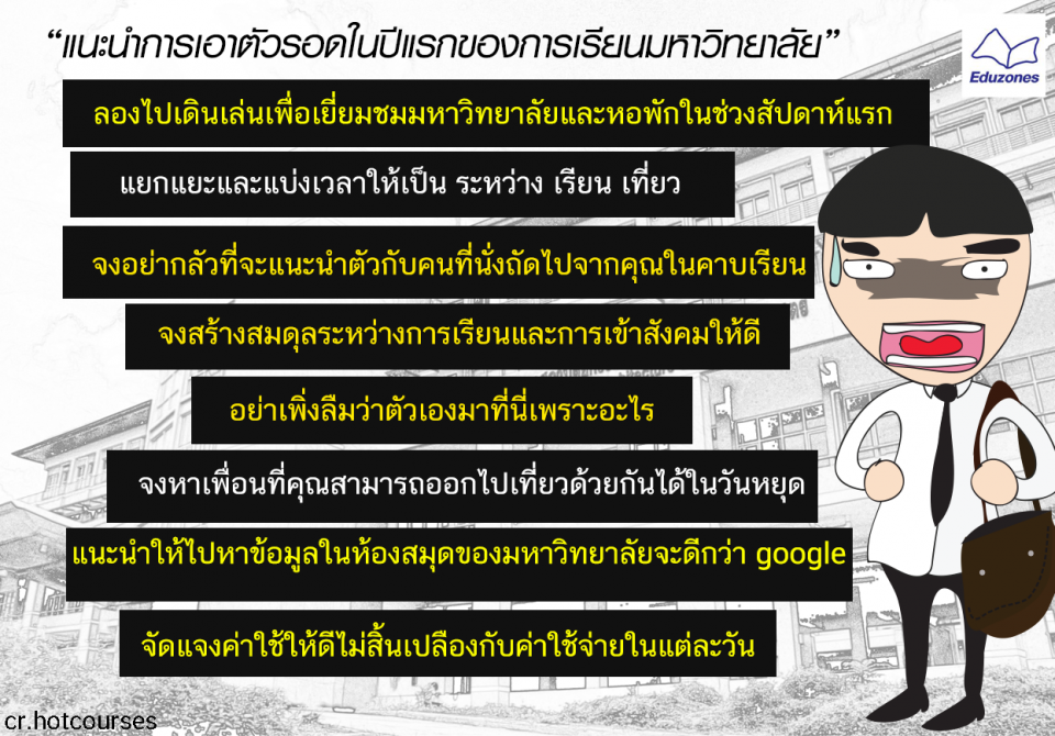 ในวันนี้ฮอทคอร์ส จะมาแนะนำ 10 เคล็ดไม่ลับในการเอาตัวรอดในช่วงเวลาปีแรกของการเรียนมหาวิทยาลัย ให้สนุกและมีความสุขไปพร้อมๆกันค่ะ
