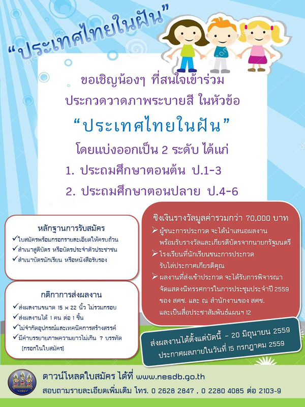 สำนักงานคณะกรรมการพัฒนาการเศรษฐกิจและสังคมแห่งชาติ (สศช.) ขอเชิญนักเรียนระดับชั้นประถมศึกษา ส่งผลงานภาพวาดเข้าประกวดในหัวข้อ "ประเทศไทยในฝัน" ชิงรางวัลมูลค่ารวมกว่า ๗๐,๐๐๐ บาท พร้อมโล่รางวัลและเกียรติบัตร โดย พลเอก ประยุทธ์ จันทร์โอชา นายกรัฐมนตรี จะให้เกียรติมอบรางวัลและเกียรติบัตร