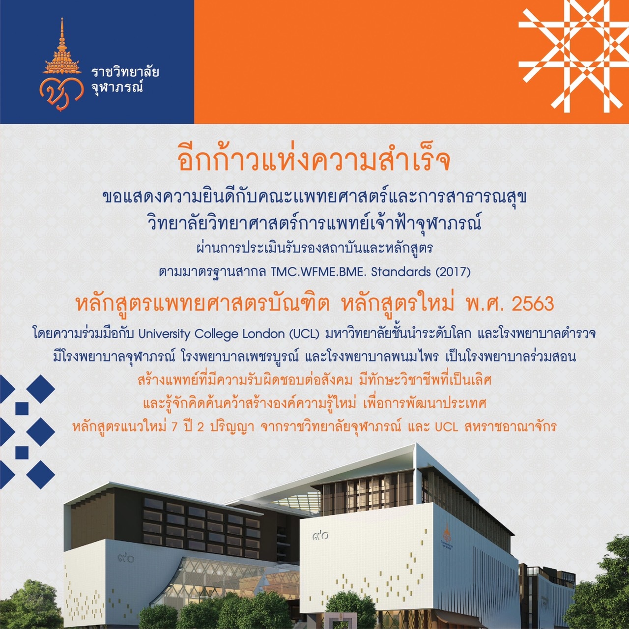 นับเป็นอีกก้าวความสำเร็จของ คณะแพทยศาสตร์และสาธารณสุข วิทยาลัยวิทยาศาสตร์การแพทย์เจ้าฟ้าจุฬาภรณ์ ที่ได้ผ่านการประเมินรับรองสถาบันและหลักสูตร ตามมาตรฐานสากล TMC. WFME. BME. Standards (2017) ผลิตหลักสูตรแพทยศาสตร์บัณฑิต หลักสูตรใหม่ (พ.ศ. 2563) ที่ได้รับความร่วมมือจาก University College London (UCL) มหาวิทยาลัยชั้นนำระดับโลก และโรงพยาบาลตำรวจ โดยมี โรงพยาบาลจุฬาภรณ์ , โรงพยาบาลเพชรบูรณ์ และโรงพยาบาลพนมไพร เป็นโรงพยาบาลร่วมสอน หลักสูตรนี้ได้พัฒนาทั้งวิธีการเรียนการสอน การประเมิน การติดตามผล ด้วยมาตรฐานการศึกษาใหม่ตามมาตรฐานสากล เน้นการสร้างแพทย์ที่รับผิดชอบต่อสังคม มีทักษะวิชาชีพที่เป็นเลิศ และรู้จักคิด ค้นคว้าสร้างองค์ความรู้ใหม่เพื่อการพัฒนาประเทศ เตรียมพร้อมแพทย์สู่อนาคตยุค Digital Health