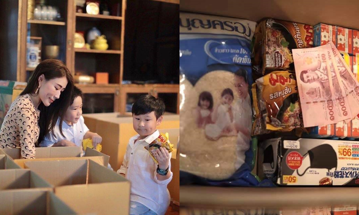 ภายใน กล่องปันสุข ... เพื่อแม่ลูกอ่อน ประกอบไปด้วย ข้าวสาร 5 กก., นมโฟร์โมส 12 กล่อง, หน้ากากอนามัย 1 กล่อง 50 ชิ้น และ มาม่า 10 ซอง บวกเงินสด 300 บาท มูลค่าประมาณ 700 บาท ต่อ 1 กล่อง
