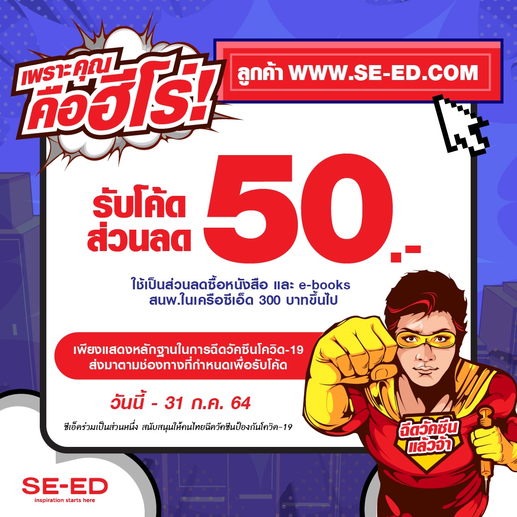*สำหรับ www.se-ed.com : ลูกค้าสามารถส่งหลักฐานการฉีดวัคซีนเพื่อรับโค้ดส่วนลด 50 บาทมาได้ที่