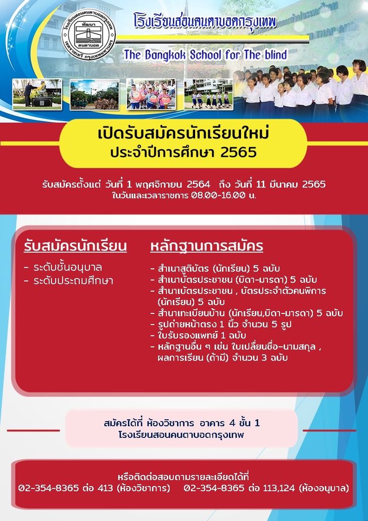 “โรงเรียนสอนคนตาบอดกรุงเทพ” โรงเรียนสอนคนตาบอดแห่งแรกของประเทศไทยภายใต้การดำเนินงานของมูลนิธิช่วยคนตาบอดแห่งประเทศไทยในพระบรมราชินูปถัมภ์ เปิดรับสมัครนักเรียนที่มีความบกพร่องทางการเห็นประจำปีการศึกษา 2565 ระดับอนุบาลและประถมศึกษา สมัครได้ที่ห้องวิชาการ อาคาร 4 ชั้น 1 โรงเรียนสอนคนตาบอดกรุงเทพ ตั้งแต่บัดนี้จนถึงวันที่ 11 มีนาคม 2565 ในวัน-เวลาราชการ สอบถามรายละเอียดโทร. 02-354-8365 ต่อ 413 (ห้องวิชาการ) 124 (ห้องระดับอนุบาล) 415 (ห้องธุรการ) หรือ e-mail: bsb@blind.or.th