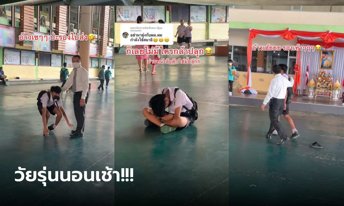 กลับไปนอนต่อที่บ้านดีกว่ามั้ย ถ้าจะหลับลึกแบบนี้ จนรอง ผอ. ต้องเดินมาเชิญไปเข้าเรียนกันเลยทีเดียว หลับแบบไม่ไหว รองเท้านักเรียนยังลืมทิ้งเอาไว้จนเกือบใส่ไปเรียน