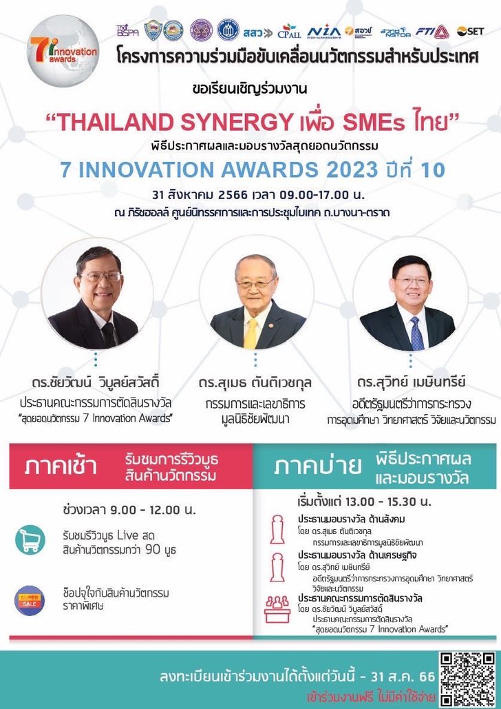 10 องค์กรพันธมิตรภาครัฐ-เอกชน ผนึก บริษัท ซีพี ออลล์ จำกัด (มหาชน) ผู้บริหารเซเว่น อีเลฟเว่นและเซเว่น เดลิเวอรี่ จัดงาน “Thailand Synergy เพื่อ SMEs ไทย ประจำปี 2023” พร้อมมอบรางวัลสุดยอดนวัตกรรม “7 Innovation Awards 2023” แก่ SME และบริษัทสตาร์ทอัพที่มีผลงานสินค้านวัตกรรมยอดเยี่ยม ในวันพฤหัสบดีที่ 31 สิงหาคม 2566 เวลา 09.00-17.00 น. ณ ภิรัช ฮอลล์ ศูนย์นิทรรศการและการประชุม ไบเทค บางนา