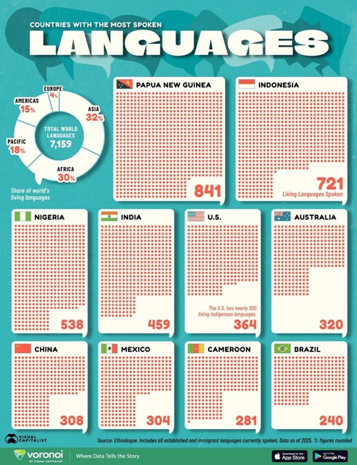 แม้ภาษาอังกฤษจะเป็นภาษาหลัก แต่ สหรัฐอเมริกา (อันดับ 5) กลับมีภาษาใช้งานจริงถึง 364 ภาษา ตัวเลขนี้เกิดจากการรวมกันของภาษาชนเผ่าพื้นเมืองเกือบ 200 ภาษา และภาษาของผู้อพยพจากทั่วทุกมุมโลกที่หลั่งไหลเข้าไปตั้งรกราก