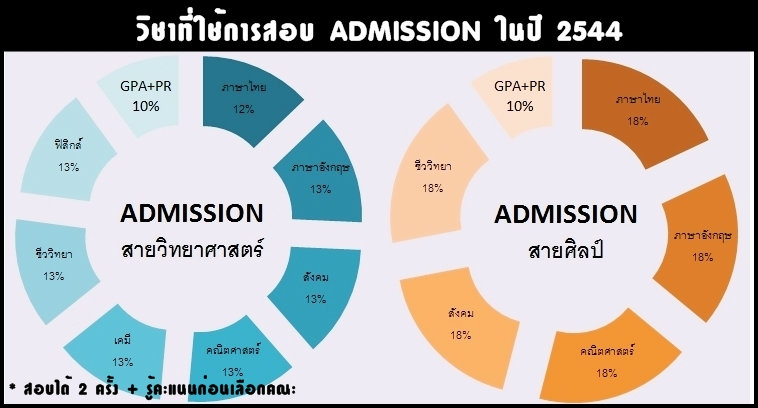 ต่อมา ระบบการศึกษาพื้นฐานได้ปรับมาใช้การจัดแบ่งแบบ 4 ช่วงชั้น และ 8 กลุ่มสาระในปี พ.ศ. 2544 (ซึ่งก็เป็นระบบการเรียนที่น้องๆ กำลังเรียนกันอยู่นั่นแหละค่ะ คือมี ป.ต้น ป.ปลาย ม.ต้น และ ม.ปลาย) ทำให้การสอบคัดเลือกเข้าสู่มหาวิทยาลัยจึงต้องปรับรูปแบบตามการจัดการศึกษาพื้นฐาน และเพื่อให้เห็นชัดถึงความแตกต่างในรูปแบบ จึงเปลี่ยนจากคำว่าEntrance หรือ "สอบเข้า" ไปเป็นคำว่า "Admission" ที่แปลว่า "รับเข้า" สิ่งสำคัญที่ถูกปรับเปลี่ยนคือการที่ผู้สมัครรู้คะแนนตนเองก่อนจึงไปเลือกสาขา จึงลดจำนวนผู้ที่ผิดหวังจากการสอบลง (เป็นข้อดีนะคะที่ได้รู้ศักยภาพว่าตัวเองมีโอกาสเข้าเรียนที่ไหนได้) และยังแก้ปัญหาเด็กที่ไม่สนใจเรียนในห้อง มุ่งกวดวิชาเฉพาะที่อยู่ในข้อสอบ ระบบ Admission จึงกำหนดให้นำค่าเกรดเฉลี่ย และระดับเปอร์เซ็นต์ไตล์ในช่วงมัธยมปลาย (GPA + PR = 10%) มา ใช้พิจารณาด้วย และยังสามารถสอบได้ปีละ2 ครั้ง คือรอบเดือนตุลาคม และมีนาคม