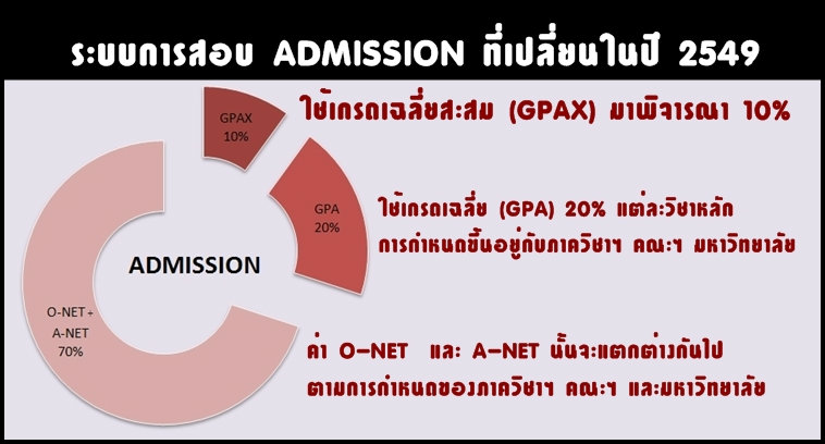 ระบบAdmission ปี 49 นั้นกำหนดให้ใช้เกรดเฉลี่ยสะสม (GPAX) มาพิจารณา 10% ใช้เกรดเฉลี่ย (GPA) 20% และให้นำคะแนน O-NET มาใช้พิจารณา 35-70% คะแนน A-NET 0-35% (ซึ่งค่าO-NET และ A-NET แตกต่างกันไปตามภาควิชาฯ คณะฯ และมหาวิทยาลัยค่ะ)