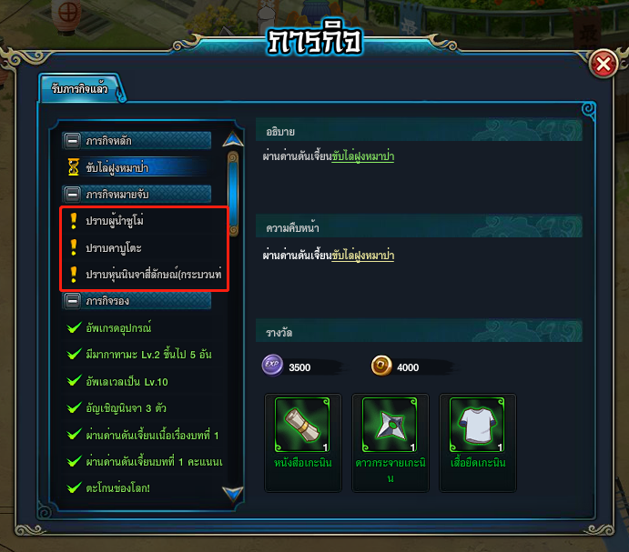 2. ภารกิจหมายจับ: ตามจับเหล่าผู้คิดร้ายในโลกนินจา เพื่อรางวัลสุดพิเศษรอท่านอยู่ สามารถทำได้วันละ 5 ครั้งต่อวัน รีเซ็ตทุกวัน โดยจะได้รับของรางวัลแบบสุ่ม ไม่ว่าจะเป็นน้ำยาพลังกาย, coin, แผนที่ขุมทรัพย์ โดยสามารถไปใช้ต่อได้ในระบบสมบัติอีกด้วย