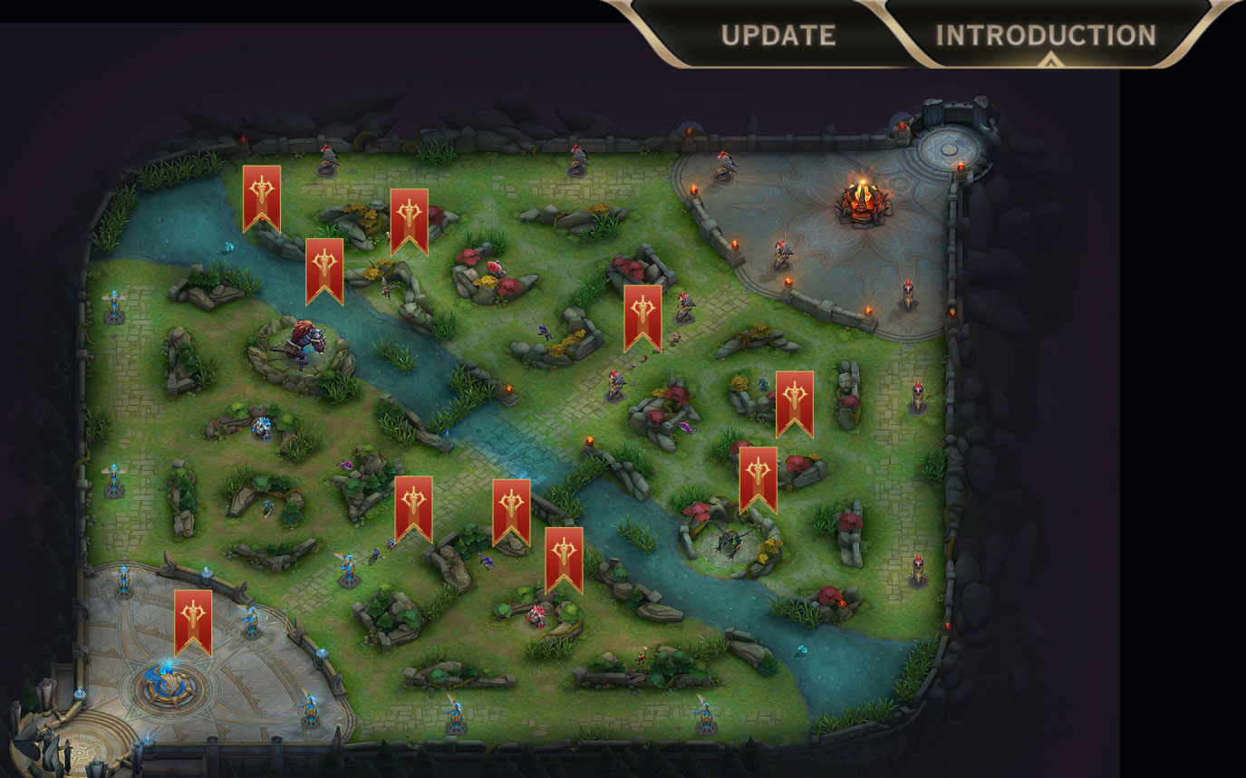แผนที่ภายในเกม นั้นจะถูกแบ่งออกเป็น 2 ฝั่ง คือ ฝั่งเราและฝั่งตรงข้าม ซึ่งจะอยู่ทิศทางตรงกันข้าม โดยมีธารน้ำคั้นกลางระหว่างสองฝั่ง มีเลนหลักๆ อยู่ 3เลน ซึ่งเป้าหมายของเกมในการเอาชนะกัน ก็คือ การทำลายป้อมใหญ่ฝั่งตรงข้ามให้ได้