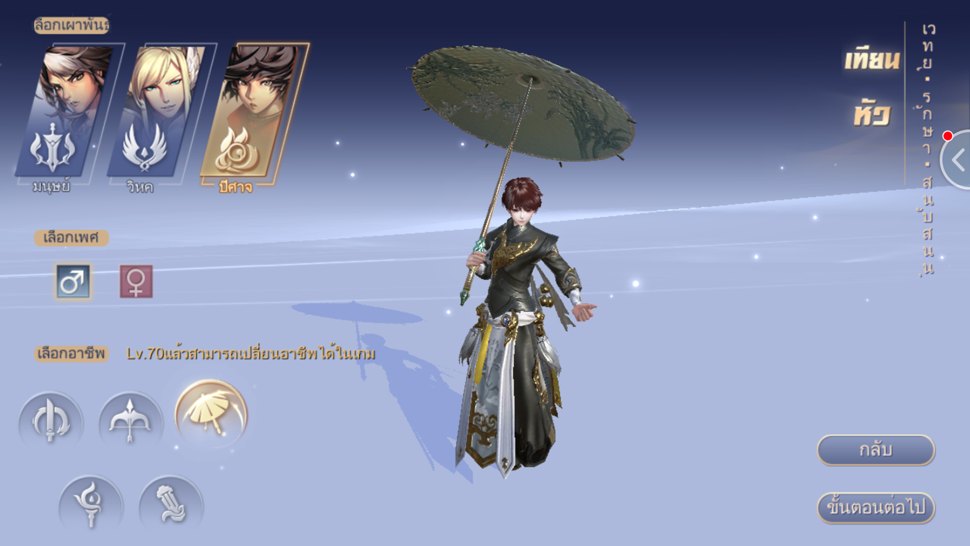เริ่มแรกเมื่อเราเข้าเกมตัวเกมจะให้เราครีเอทตัวละครขึ้นมาหนึ่งตัว โดยในเกม Sky Castle : คำสาบานรัก นี้มีระบบสร้างตัวละครที่ค่อนข้างน่าสนใจทีเดียว เราสามารถเลือกเผ่าพันธุ์ได้ถึง 3 เผ่าด้วยกันคือ มนุษย์ วิหค และปีศาจ โดยทั้ง 3 เผ่าพันธุ์ สามารถเลือกเพศและอาชีพได้อย่างอิสระ (บางเผ่าไม่สามารถใช้บางอาชีพได้) ในส่วนของอาชีพพื้นฐานที่ตัวเกมให้เราเลือกเล่นนั้นเริ่มแรกมีให้เลือกมากถึง 5 อาชีพด้วยกัน ได้แก่ ผู้พเนจร / อวี่หมัง(ธนู) / เทียนหัว (สายเวทย์รักษาใช้ร่มเป็นอาวุธ) / นักเวทย์ลับ (สายเวทย์โจมตี) / นักกวีพเนจร (สายเวทย์ควบคุมสนับสนุน)