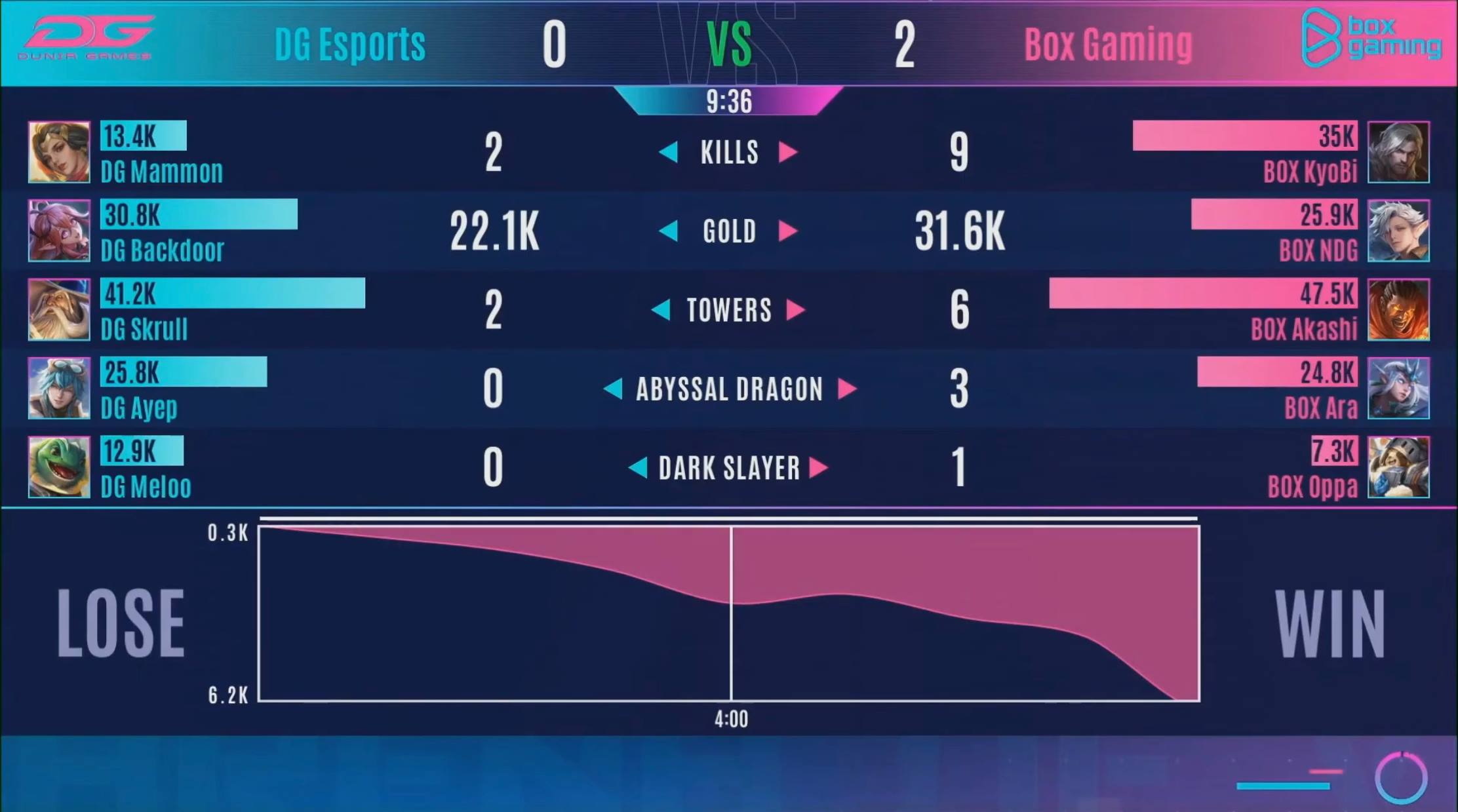 - BOX Gaming เดินเกมอย่างรวดเร็วและจัดการ Dark Slayer ไปในนาทีที่ 7 ซึ่งค่อนข้างเร็วมาก