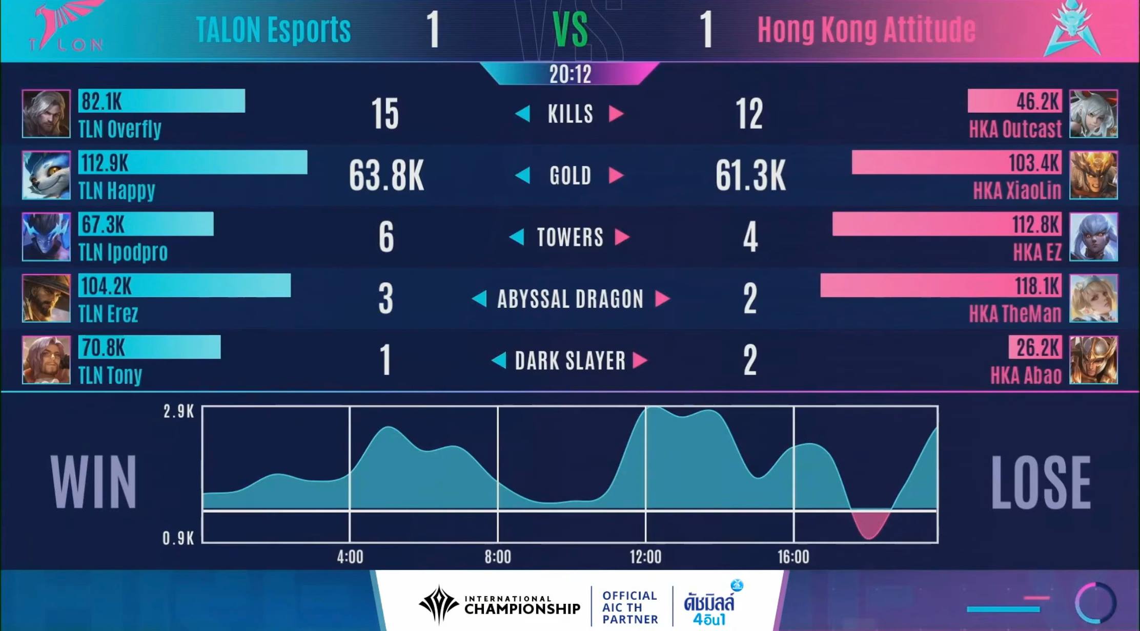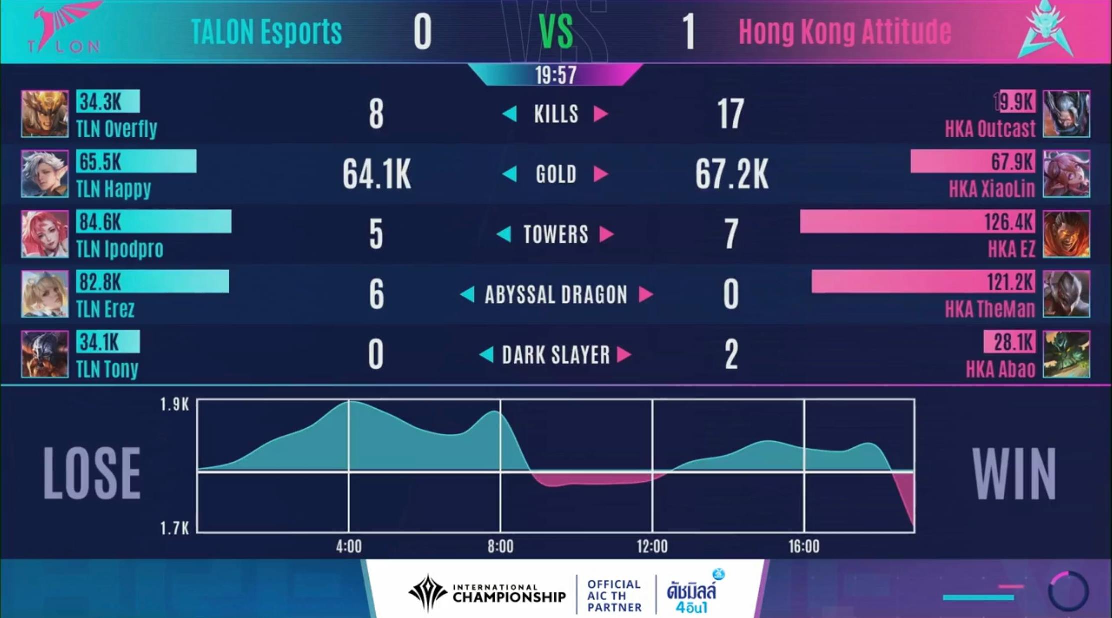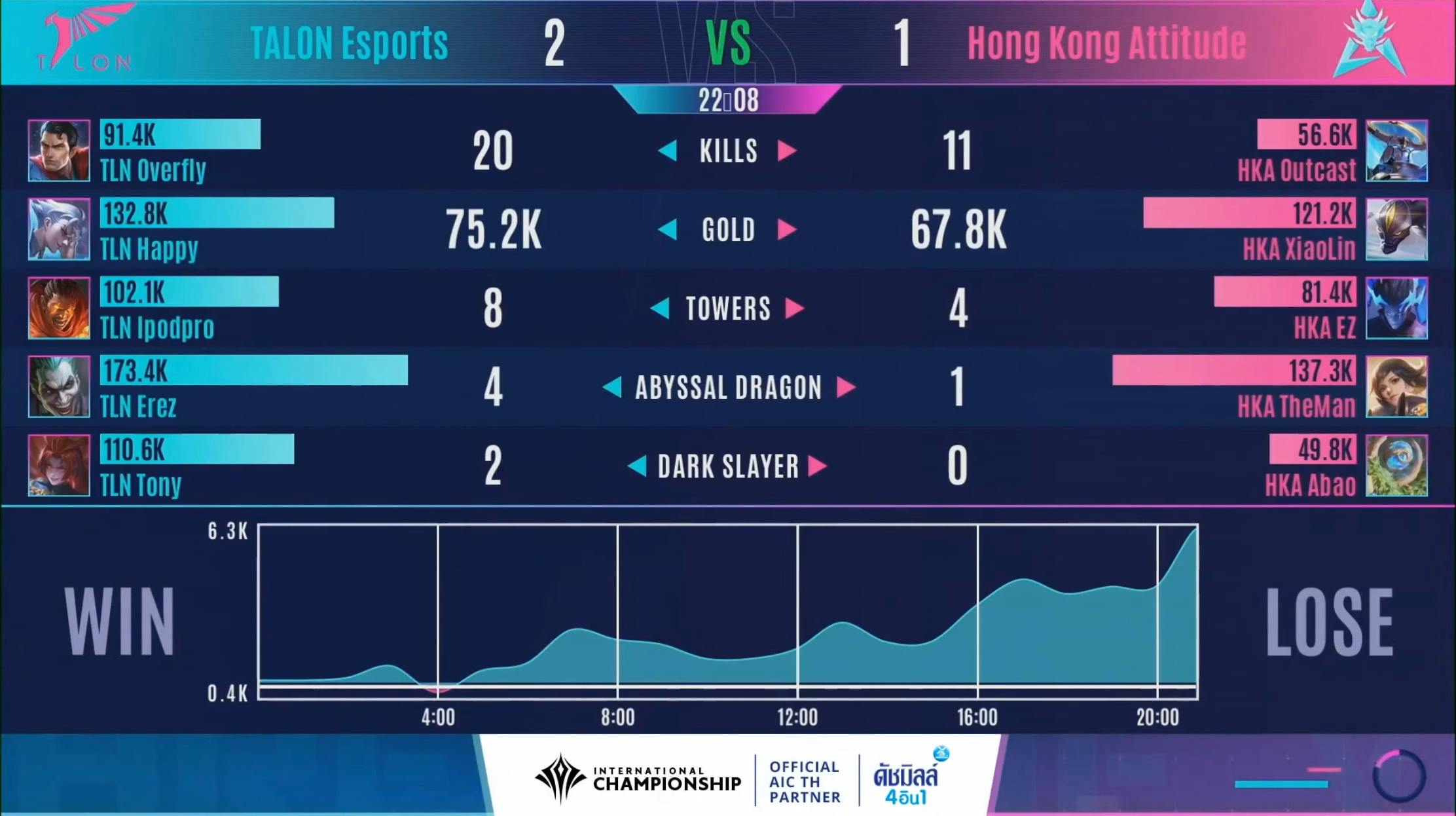 - นาทีที่ 19 Talon ใช้พลัง Fighter 3 ตัวซื้อเวลาให้ Carry ทำ DMG บดขยี้ HKA ได้ทั้งหมดและทำการปิดเกมกลับมาเสมอได้ 1-1