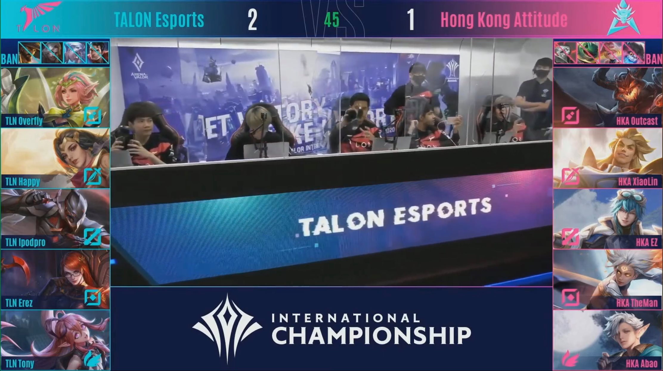 - ฝั่ง Hong Kong Attitude เลือก Ban Hero : Zip, Ryoma, Mina, Xeniel : Zip มีความคล้าย Rouie ในการแหกกฎเกมพอสมควรจึงถูกแบนไปในเหตุผลเดียวกัน และ Xeniel ที่สามารถใช้แผนแยกดันได้อย่างมีประสิทธิภาพ HKA เลย Ban ไปแบบไม่ต้องมากวนใจ