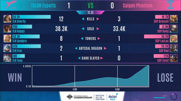 - เกมที่ 1 Talon Esports รู้ดีว่าการปล่อยให้ทาง Saigon Phantom มีพื้นที่ในการเล่นฟาร์มนั้นไม่ใช่เรื่องดีแน่ Hayate หากเกิดแล้วสามารถจะใช้ Kunai Blitz ที่เป็น AOE True DMG เข้ามาเก็บ Talon ได้ทั้งทีมเห็นแต่ Talon ก็คาดไว้แล้วเลยเลือกรูปแบบ Hero Fighter 3 ตัวในการเดินเกมที่รวดเร็วและแน่นอนว่า Talon ทำได้มากจน Saigon Phantom ไม่สามารถฆ่าทีมTalon ได้และปิดเกมไปด้วยสกอร์ 1-0