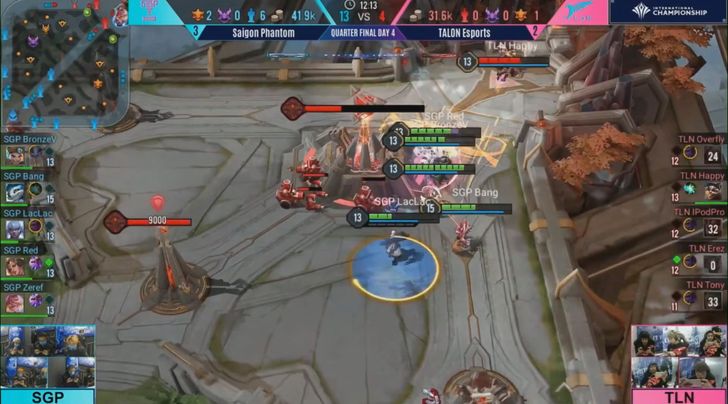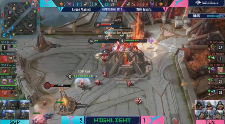- เกมที่ 2 จริงๆเกมนี้ Talon Esports ค่อนข้างเสียเปรียบด้วยรูปแบบฮีโร่ที่ถูกบังคับให้ต้องเดินเกมเร็ว และแม้ว่าการ Burst DMG จะแข็งแกร่งแต่ความเสี่ยงที่จะต้องทำเกมให้ได้ในช่วงต้นนั้นทาง Saigon Phantom ก็รู้ดีและเลือกฮีโร่ในรูปแบบที่ค่อนข้างมั่นใจเลยว่าพวกเขาจะอยู่ได้ในช่วงท้ายเกม แล้วก็เป็นไปตามคาดว่า Saigon Phantom สามารถซื้อเวลาได้และรอเพียงเวลาและความสามารถของฮีโร่ก็สามารถที่จะทำเกมชนะ Talon Esports มาได้ตีเสมอกลับมาเป็น 1 ต่อ 1