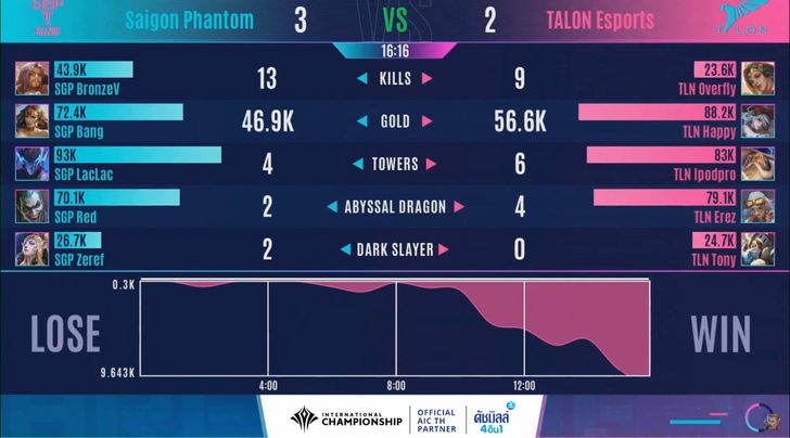 - เกมที่ 1 Saigon Phantom ค่อนข้างหวังกับ Hayate ที่มาแก้ Fighter ที่หนาและจำนวนมากของ Talon กับ Enzo ที่เราก็ทราบกันดีว่าจุดแข็งทีมนี้มี SGP : Red และ SGP : Bang ที่เล่น Enzo