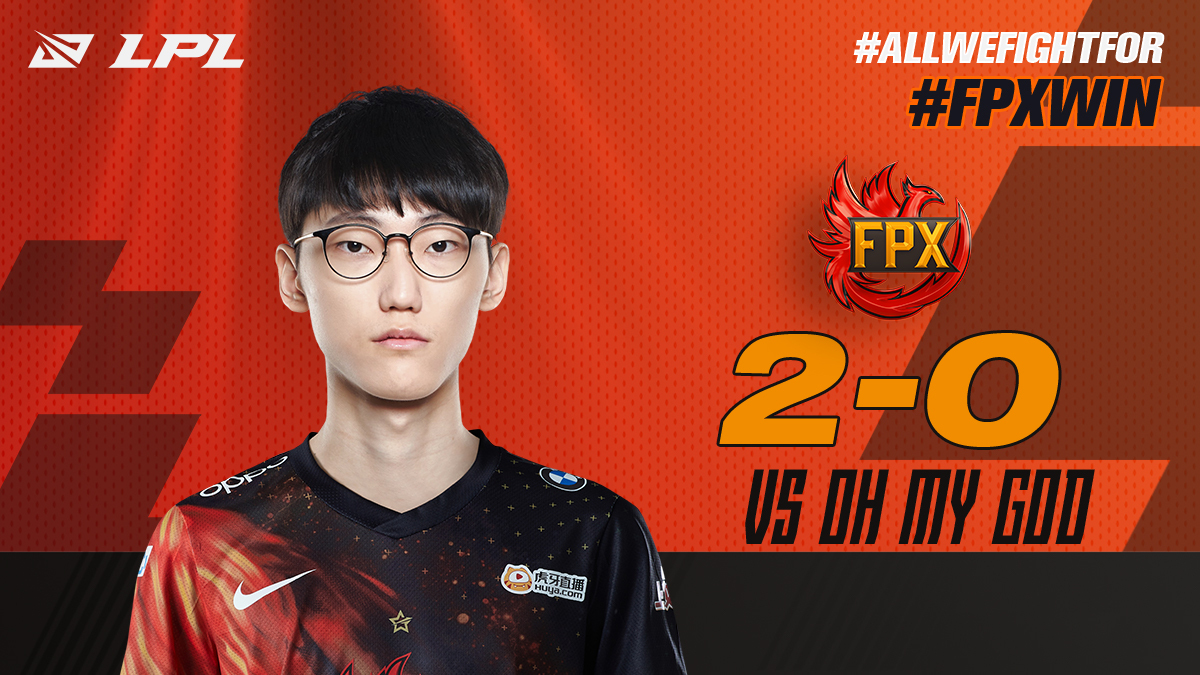 OMG ถือว่าทำได้ดีทีเดียวในกับ EDG แต่พลาดท่าเสียเกมที่สามไป ในคราวนี้พวกเขาต้องมาเจอกับ FPX อดีตแชมป์เวิลด์ปี 2019 ที่เสริมทัพใหม่ด้วยตัวของ Nuguri จากทาง Damwon แชมป์เวิลด์ปีล่าสุดรวมถึงเป็นการ Debut ของเขาใน LPL ด้วย และคู่นี้น่าจะเป็นสัญญาณบอกว่า Nuguri ทำได้ดีขนาดไหนใน LPL