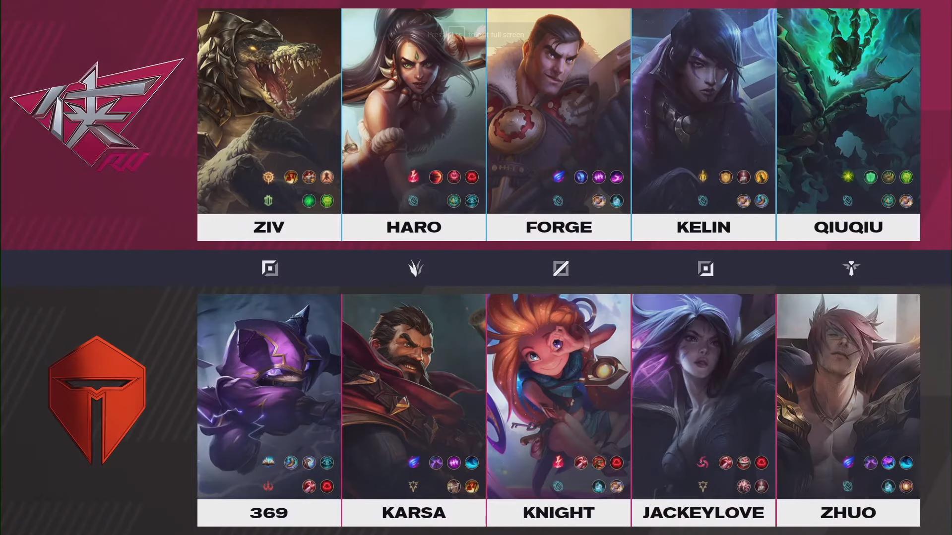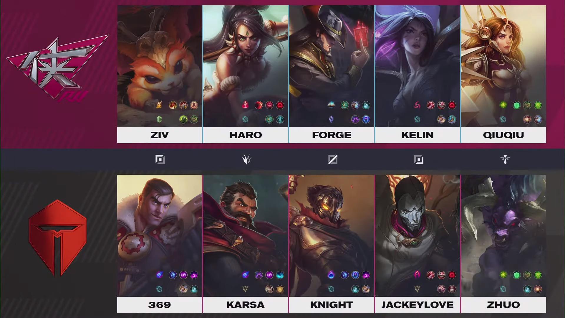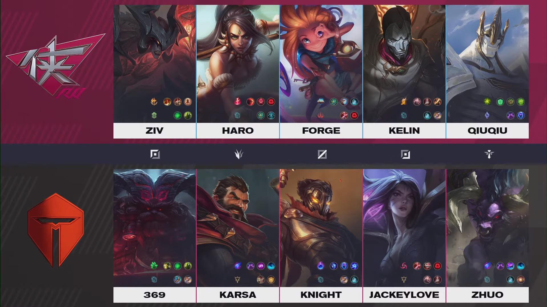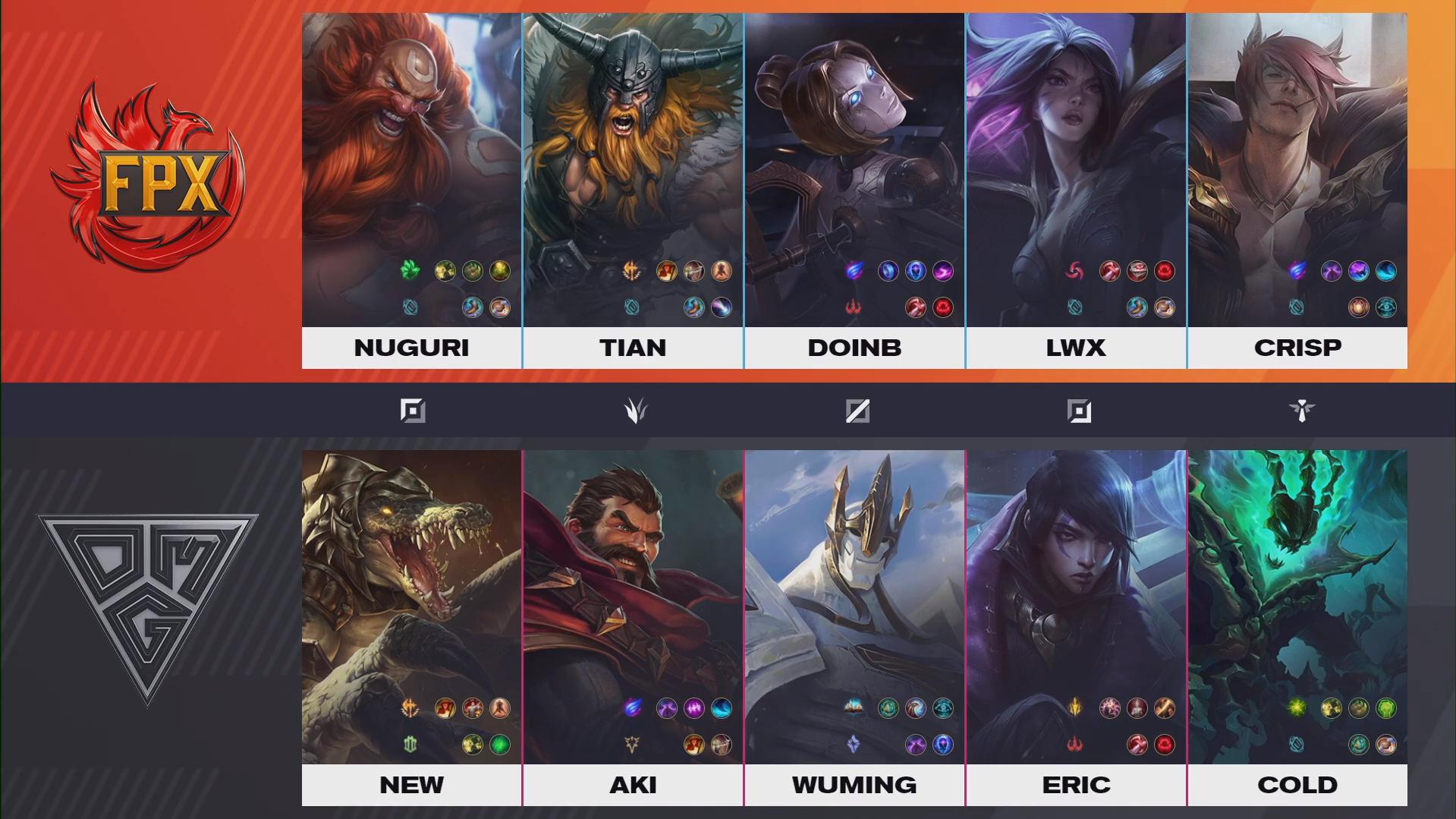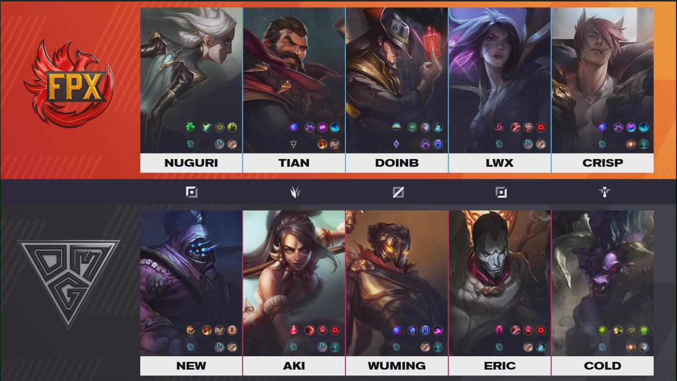 เรียกว่าทั้งสองทีมเลือกแชมป์เปี้ยนที่ค่อนข้างหน้าตาคุ้นเคยกับ Meta นี้ FPX ใช้ตัวไดว์และตัวที่มีศักยภาพในการเปิดไม่ว่าจะ Gragas Olaf และ Sett แล้วมี Orianna มาทำคอมโบทีมไฟท์ ปิดดาเมจด้วย Kaisa ในขณะที่ OMG ใช้ทีมที่ทรงพลังในช่วงกลางเกมอย่าง Renekton รวมไปถึง Galio ที่พร้อมโดดลงทีมไฟท์ โดยมี Graves และ