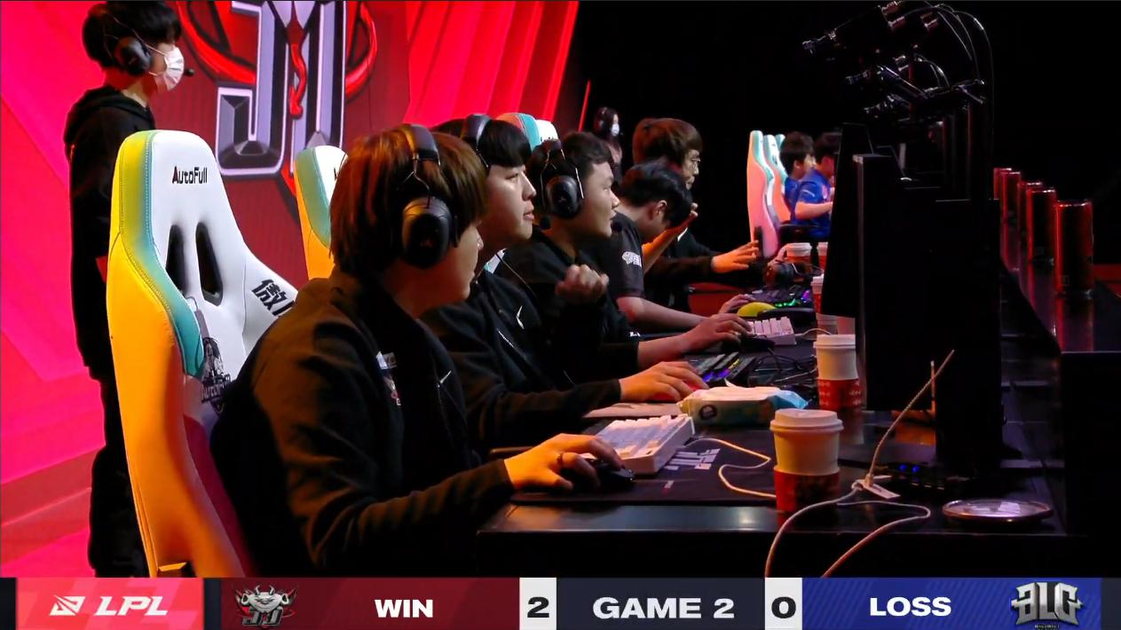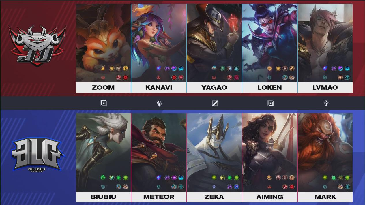 BLG ใช้แนวหน้าถึงสามคนเพื่อ Graves และ Samira สอง ADC สามารถเล่นได้อย่างเต็มที่ ในขณะที่ทาง JDG มีพลังทีมไฟท์ที่ทรงพลังไม่น้อย แถมด้วย Twisted Fate ที่เอามาเดินตามกาลิโอในจังหวะการแจมเลนข้าง เรียกว่าไม่ได้เปรียบเสียเปรียบกันมากนัก