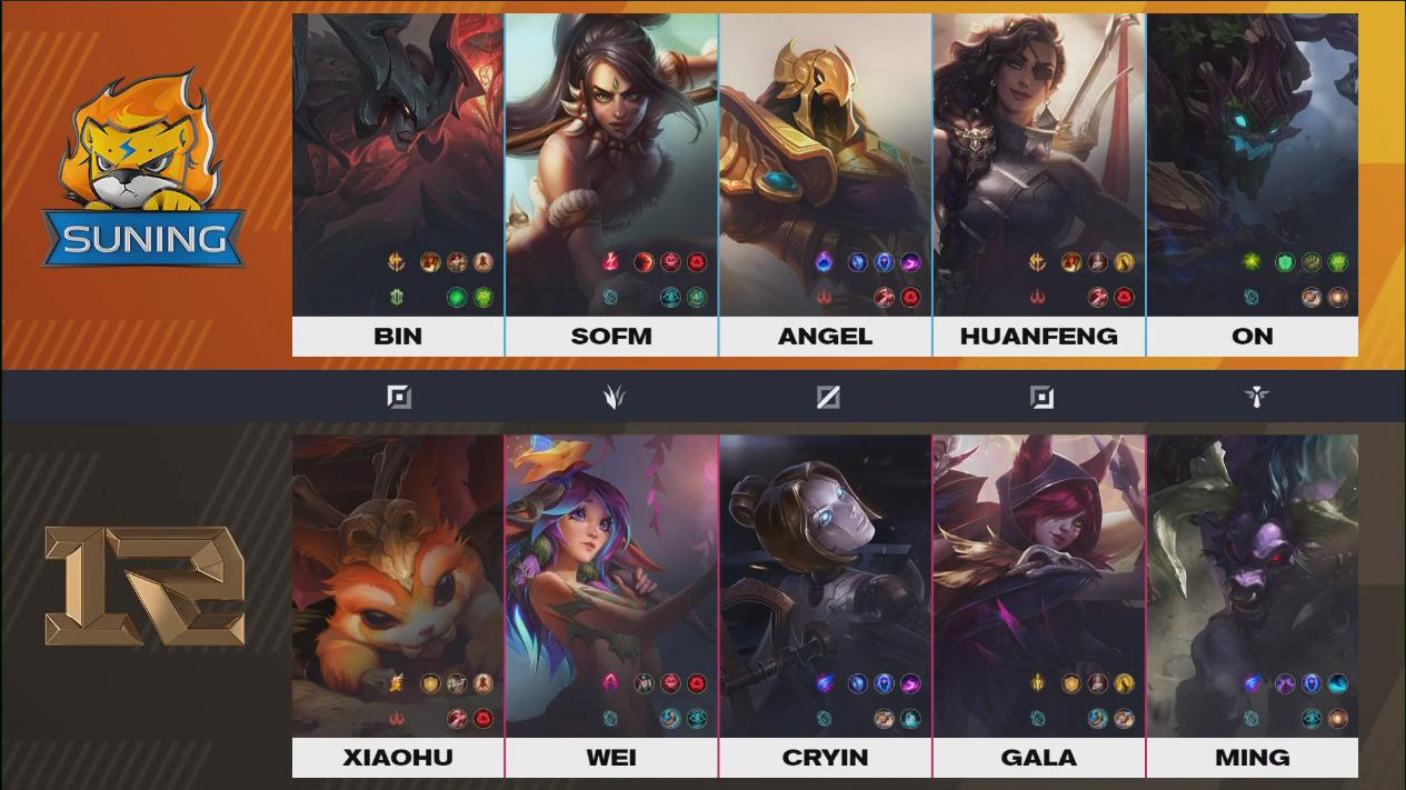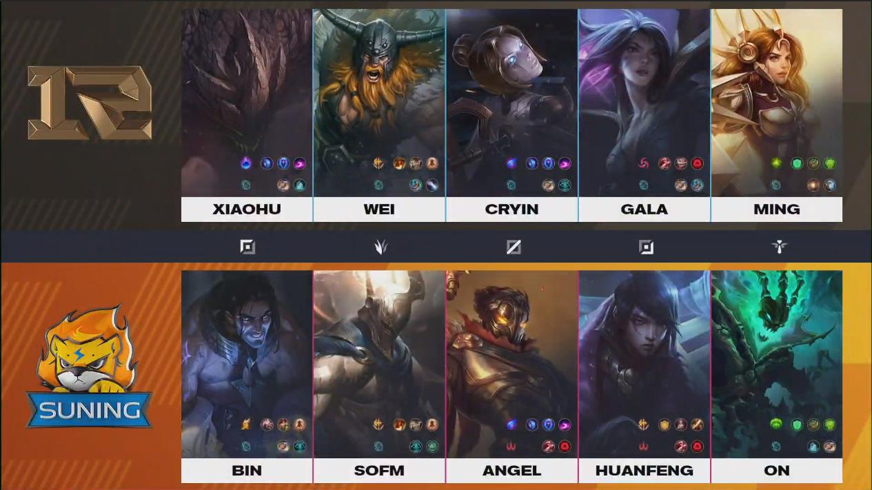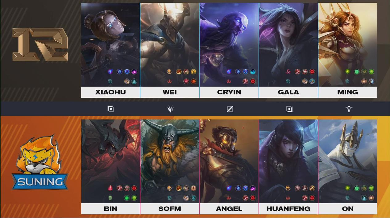 น่าจะเป็นตัวละครที่คุ้นหน้าคุ้นตากันอย่างดีในช่วงหลายวันมานี้ทั้งสองทีม ที่แปลกหน่อยก็คือ Ryze ของ RNG แต่ที่แปลกหนักกว่าคือการหยิบ Orianna ที่หยิบขึ้นมา Top ซึ่งเป็นเรื่องแปลกพอสมควรทีเดียว แต่นั้นทำให้ Comp ของ RNG มีดาเมจที่หนักหน่วงมากๆ ในขณะที่ SN ก็มีแผงหน้าที่แข็งแกร่ง และ Carry ที่พร้อมทำลายทุกอย่างในท้ายเกม