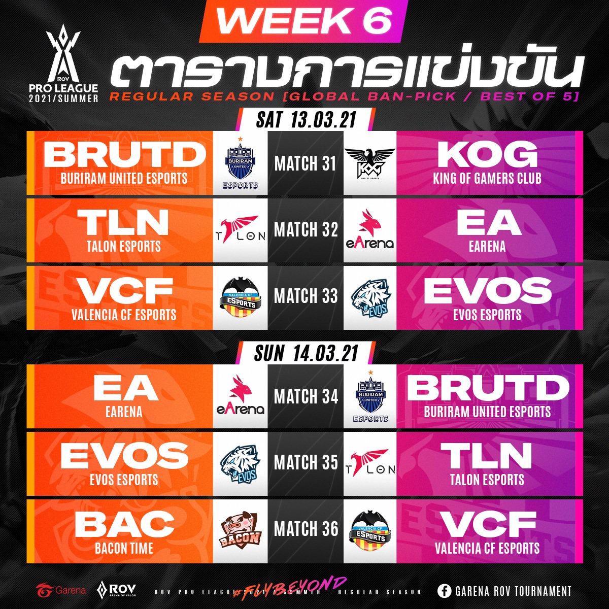 แต่ก่อนจะถึงช่วงเวลานั้นเราก็มี Match อุ่นเครื่องกันก่อนกับ RoV All-Star Show Match ที่ถูกจัดขึ้นก่อนการแข่งขันใหญ่นั้น ก็ได้เริ่มขึ้นแล้วก็สามารถรับชมได้ทางช่องทางหลักของ Garena ได้เลย และแน่นอนว่าเพื่อนๆหลายคนน่าจะอยากติดตามงานแข่งนี้อย่างใกล้ชิด ถ้าใครเป็นแฟนคลับของสโมสรใดนั้นก็สามารถติดตามรับชมกันได้ ผมนั้นก็ได้อาสานำตารางการแข่งขัน ที่กำลังจะมีขึ้นในตลอดเดือนกุมภาพันธ์ - เดือนมีนาคมนั้นให้เพื่อนๆได้รับชมกัน ซึ่งก็จะเป็นการแข่งขันรอบ Regular Season ของ RoV Pro League 2021 Summer ซึ่งเพื่อนๆจะได้รับชมกันอย่างจุใจแน่นอน