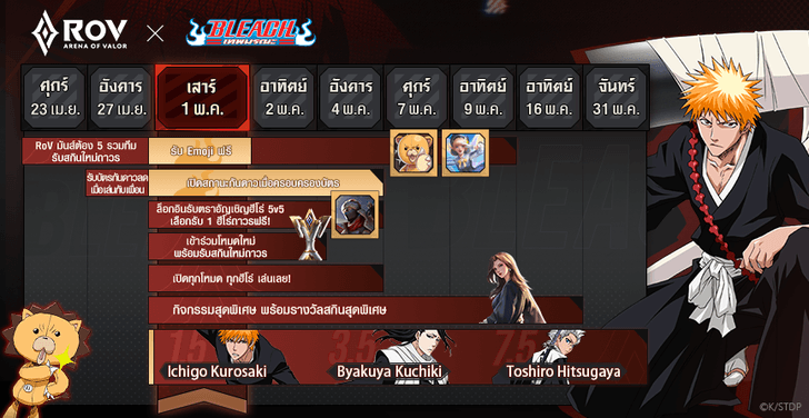 สวัสดีเพื่อน ๆ ชาว RoV ที่น่ารักทุกคนอย่างที่ผม ได้เขียนไปก่อนหน้านี้ว่ามีการผสานความร่วมมืออย่างยิ่งใหญ่ระหว่าง RoV X Bleach เทพมรณะที่บอกได้เลยว่าน่าสนใจมาก ๆ และการนำผลงานตัวละครจากเรื่อง Bleach เทพมรณะมาจัดทำในรูปแบบสกินให้พวกเราได้เล่นกันซึ่ง Hero ที่มารับบทบาทนี้เพื่อน ๆ คงทราบกันไปบ้างแล้ว และผมจะมานำเสนอข้อมูลตัวละครของ Bleach เพิ่มเติมและเพิ่มอรรถรส ในการเล่นในอนาคตอันใกล้นี้ เอาล่ะครับไปดูกันเลย