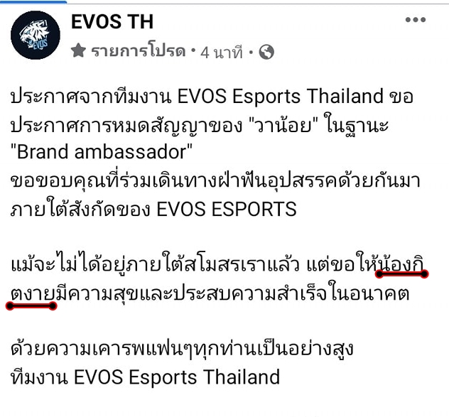 แต่เรื่องที่ไม่ได้คาดฝันก็เกิดขึ้น เมื่อการโพสต์ของ EVOS Esports Thailand กลายเป็นเรื่องโอละพ่อ !! เมื่อแฟน ๆ ที่กำลังซึ้งกับการประกาศอำลาวาน้อยอยู่..ถึงต้องกลับสะดุด และต้องกลายเป็นการกลั้นขำแทน กับการอำลาที่ผิดฝาผิดตัวไปหน่อย เมื่อสิ่งที่พวกเขาอ่านนั้น แทนที่จะเป็นวาน้อย กลับเป็น "กิตงาย" อดีต Brand Ambassador ผู้ซึ่งไปจาก Evos นานมากแล้ว 555 หรือจะเป็นการอำลาอีกครั้ง จากความคิดถึงจากใจจริงของ EVOS Esports Thailand ก็เป็นได้ 55