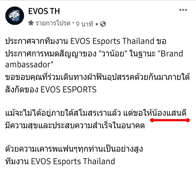 สวัสดีเพื่อน ๆ ชาว RoV ที่น่ารักและผู้ติดตาม Esports ทุก ๆ ท่านไม่นานมานี้ทางสโมสร Evos Esports ที่พึ่งมีประเด็นมาไม่นาน ก็ได้รับข่าวร้ายอีกข่าวหนึ่ง หรือจะเป็นเรื่องเฮฮาดี (ผมว่าข่าวร้ายนะ) ที่นักแข่งที่มีคนติดตามมากที่สุดคนหนึ่งอย่าง "วาน้อย" Dark Slayer Lane ที่มีความสามารถเฉพาะตัวสูงคนหนึ่ง และยังเป็นผู้เล่นที่เก่งกาจ จนมีทางแฟนคลับติดตามเป็นจำนวนมาก ภายใต้สังกัด Evos Esports ได้หมดสัญญาลงในฐานะ Brand Ambassador