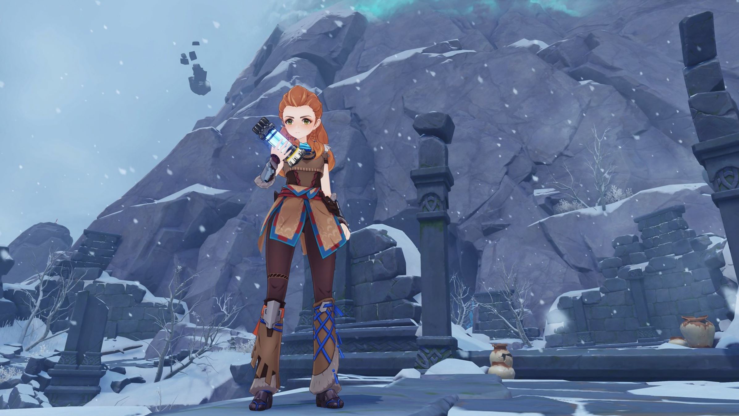 Aloy เป็นนักธนูจากเผ่า Nora เมื่อเธอเดินทางมาถึงโลก Teyvat เธอก็ได้รับ Cryo Vision และได้รับพลังใหม่ที่ทำให้เพิ่มความสามารถในการใช้ธนูของเธอมากขึ้น Elemental Burst ของ Aloy มีชื่อว่า "Prophecies of Dawn" ซึ่งเธอสามารถใช้สกิล "Frozen Wilds" ในการขว้าง Freeze Bomb หรือ Power Cell ที่เต็มไปด้วยธาตุ Cryo เพื่อทำให้ศัตรูกลายเป็นน้ำแข็ง