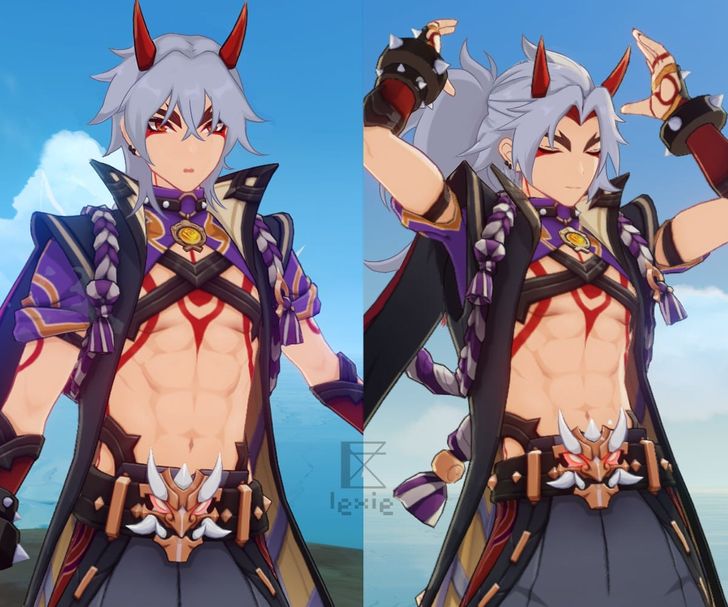 คิวของพ่อหนุ่มอสูรประจัญบานถูกจับเปลี่ยนทรงผม แบบแรกทำให้ดูเป็นหนุ่มเกาหลีแบบแปลก ๆ หน่อย แแต่ทางด้านขวาทรงผมผูกรวบหางม้าแบบซามูไรนี้เป็นอะไรที่เข้ากับ Arataki Itto เป็นที่สุด