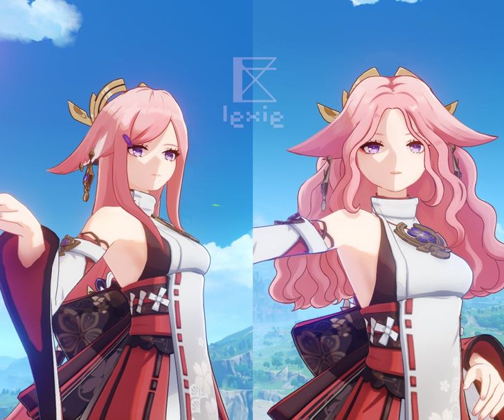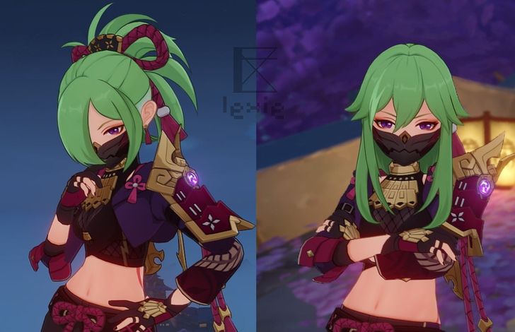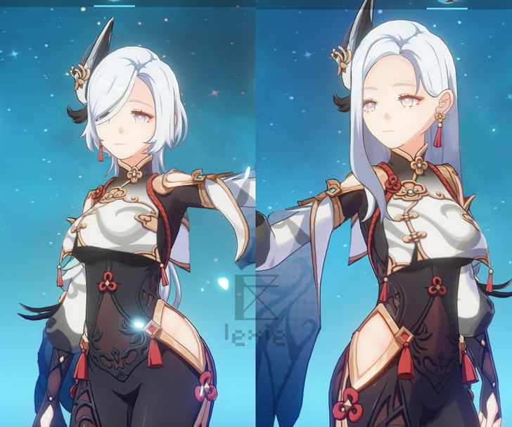 มาถึงสาวสวยคนแรกแห่ง Liyue ที่ปกติแล้วทรงผมสั้นก็เร้าใจสวยแซ่บเวอร์อยู่แล้ว ซึ่งดูจากในรูปซ้ายก็ยังเป็นแบบผมสั้นอยู่แต่ใส่ความเท่ผสมเข้าไป ส่วนทางขวาทำให้เราเห็นเลยว่าหาก Yelan ผมยาวนี่จะเป็นตัวละครที่ดูสวยมากเลยทีเดียว