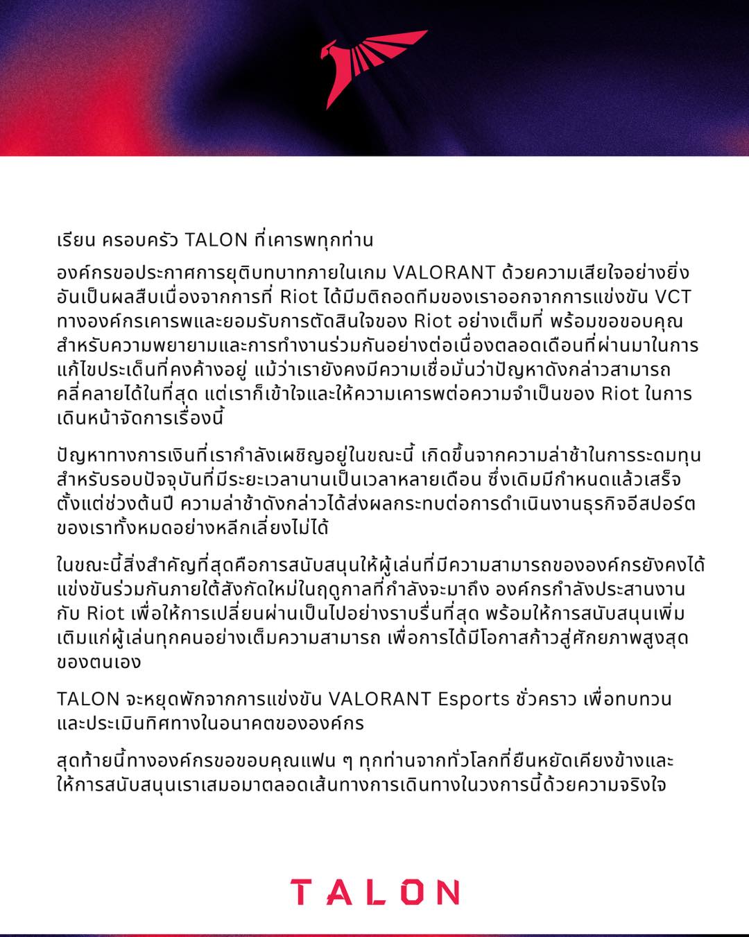 “TALON จะหยุดพักจากการแข่งขัน VALORANT Esports ชั่วคราว เพื่อทบทวน และประเมินทิศทางในอนาคตขององค์กร” TALON กล่าวทิ้งท้าย “สุดท้ายนี้ทางองค์กรขอขอบคุณแฟน ๆ ทุกท่านจากทั่วโลกที่ยืนหยัดเคียงข้างและ ให้การสนับสนุนเราเสมอมา ตลอดเส้นทางการเดินทางในวงการนี้ด้วยความจริงใจ