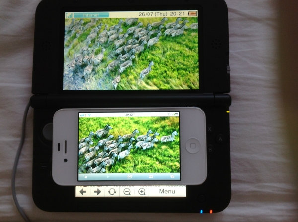 ต่อมาลองเปิดบราวเซอร์ดู อันนี้อาจจะไม่เวิร์คเท่าไหร่ เพราะจอใหญ่ขึ้น แต่ความละเอียดเท่าเดิม มันเลยค่อนข้างหยาบ (มาก) โดยเฉพาะอย่างยิ่งถ้าอ่านตัวหนังสือบนเว็บ แทบจะเป็นอะไรที่ทำลายสายตามาก อันนี้ลองเปิดรูปเดียวกันเปรียบเทียบกับ iPhone4S ด้วย อาจจะไม่ยุติธรรมเท่าไหร่ แต่พอจะเห็นความแตกต่างได้พอสมควร ส่วนตัวเสียดายมากที่ Nintendo ไม่ยอมเพิ่ม DPI ให้เยอะขึ้น แต่เข้าใจว่าจะเอาจอขนาดนั้นมาคงแพงตาเหลือกอยู่เหมือนกัน