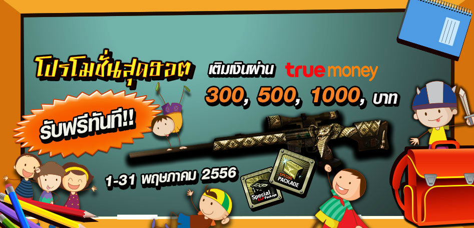 เกม Special Force เอาใจนักเรียน นักศึกษา น้องใหม่ทุกสถาบันที่กำลังจะเปิดเทอมด้วยโปรโมชั่นแรงสุดฮอต เมื่อเติมเงิน DE ผ่านช่องทาง true money 300, 500, 1000 บาทรับฟรีทันทีปืนซุ่มยิงลายงู COBRA PSG-1 และไอเทมแพ็คเกจที่ชาว Special Force ต้องการ